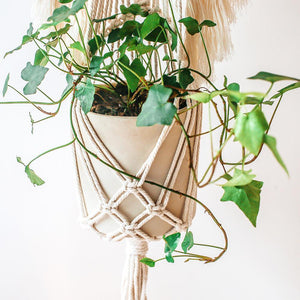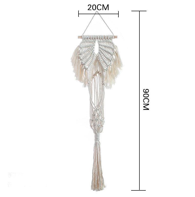 A handmade wooden stick and macrame cotton Angel Wings Plant Hanger to add a modern bohemian vibe to an unadorned wall.